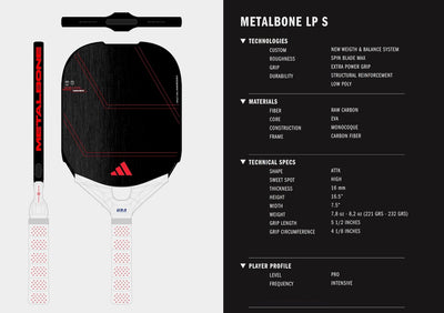 All four of the new Metalbone paddles are designed using a "monocoque" construction method that wraps the entire core into one seamless molded exterior, comparable to an egg shell. They all come in adidas' ATTK shape, which is an elongated shape that offers increased reach and power and places the sweet spot slightly above the center of the paddle.