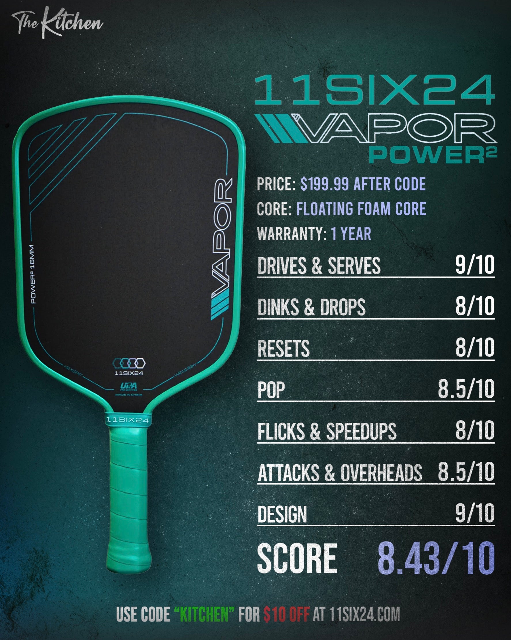 With the release of the full-foam Vapor Power 2, 11six24 introduced a new grit technology its calling "HexGrit." The paddle face is very gritty to the touch, and the brand claims the HexGrit is more durable than raw carbon fiber and other grit technologies on the market.