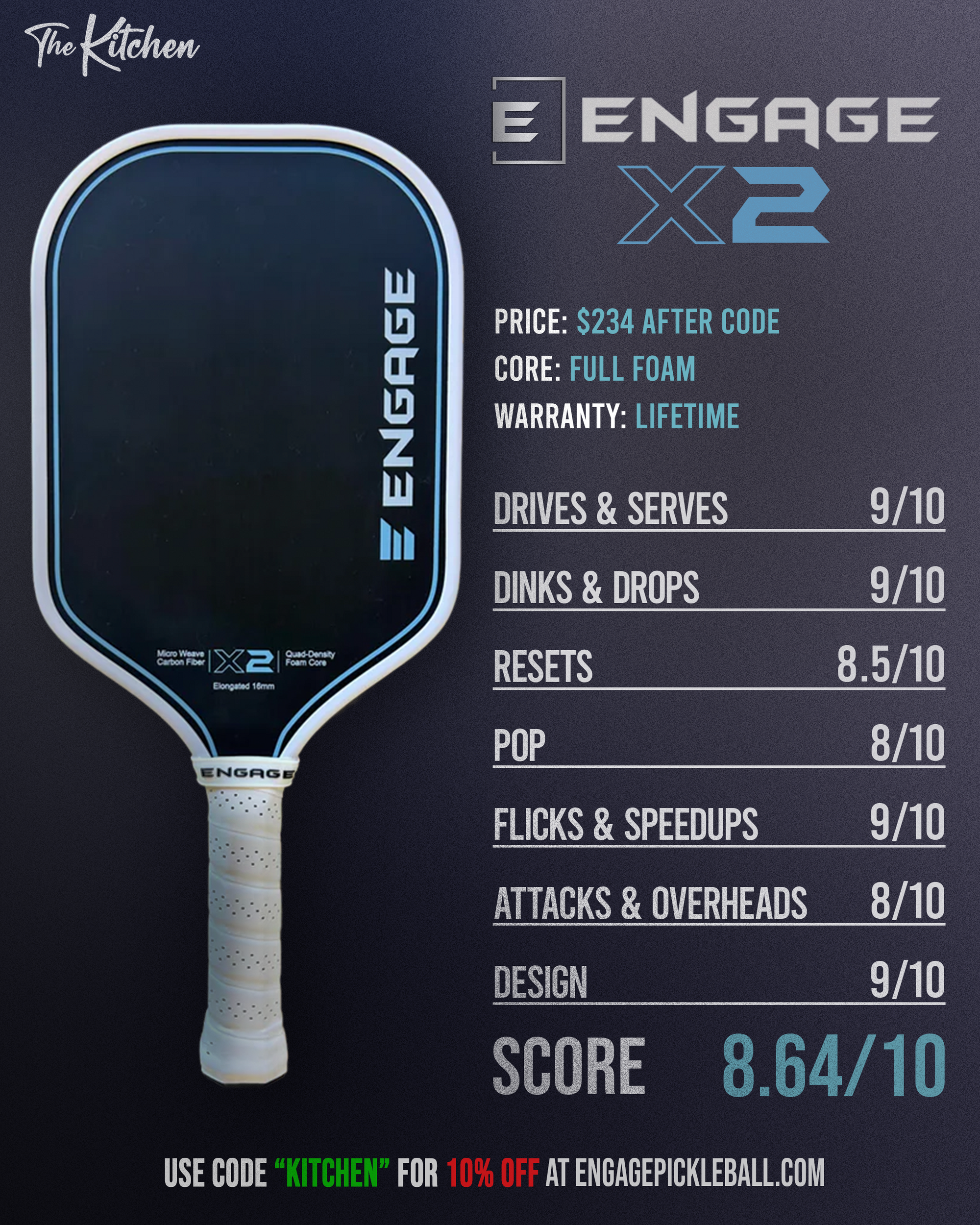 The X2 is Engage's second full-foam offering, following the Engage Profoam that was released in 2025. The new model features a "Quad Density" foam core and a new approach to the carbon fiber face, a combination that delivered great feel and elite-level spin in our testing.
