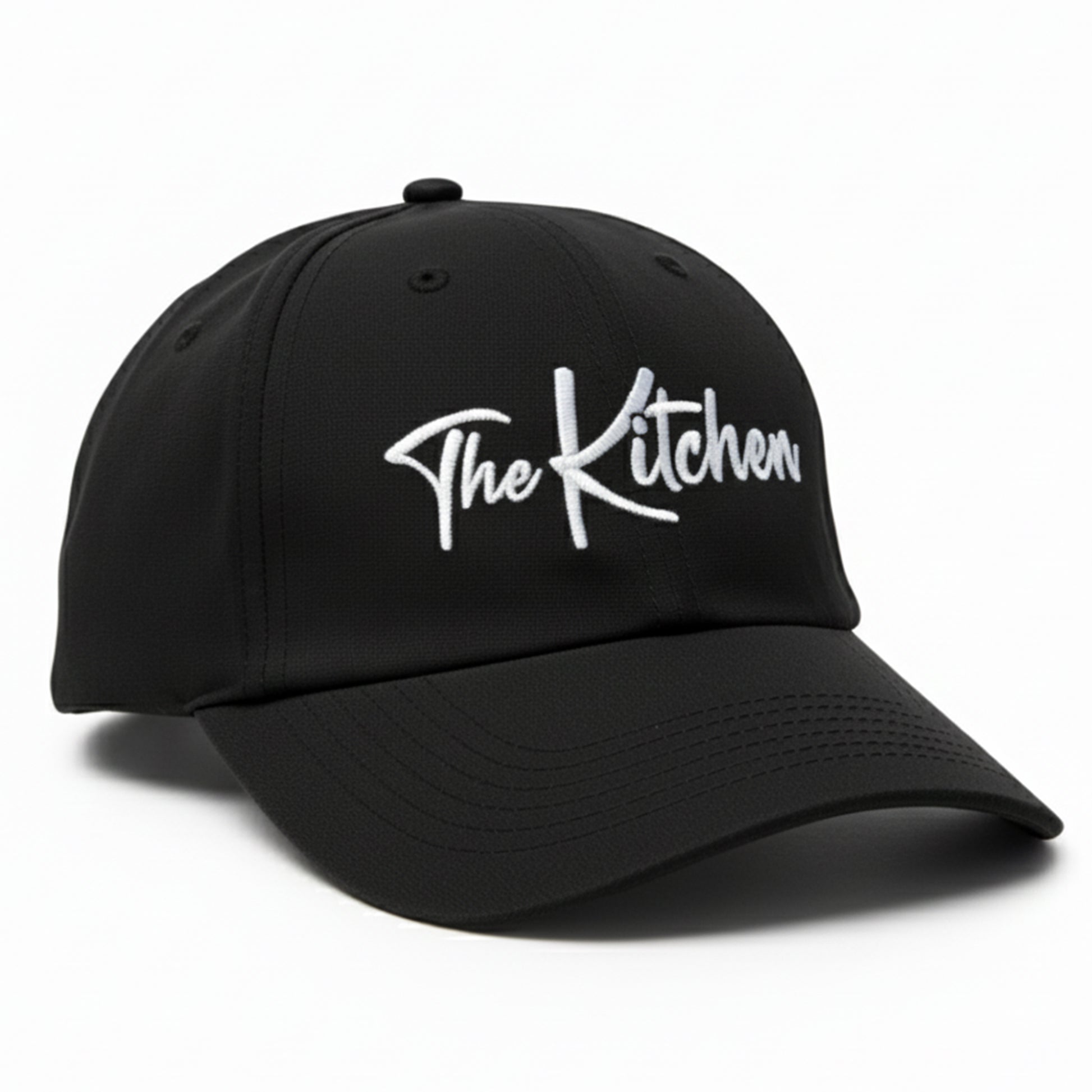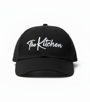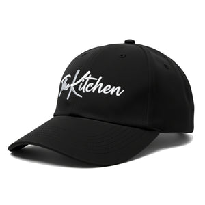 The Kitchen's classic black dad hat. White logo. Lightweight breathable fabric and soft structured profile.