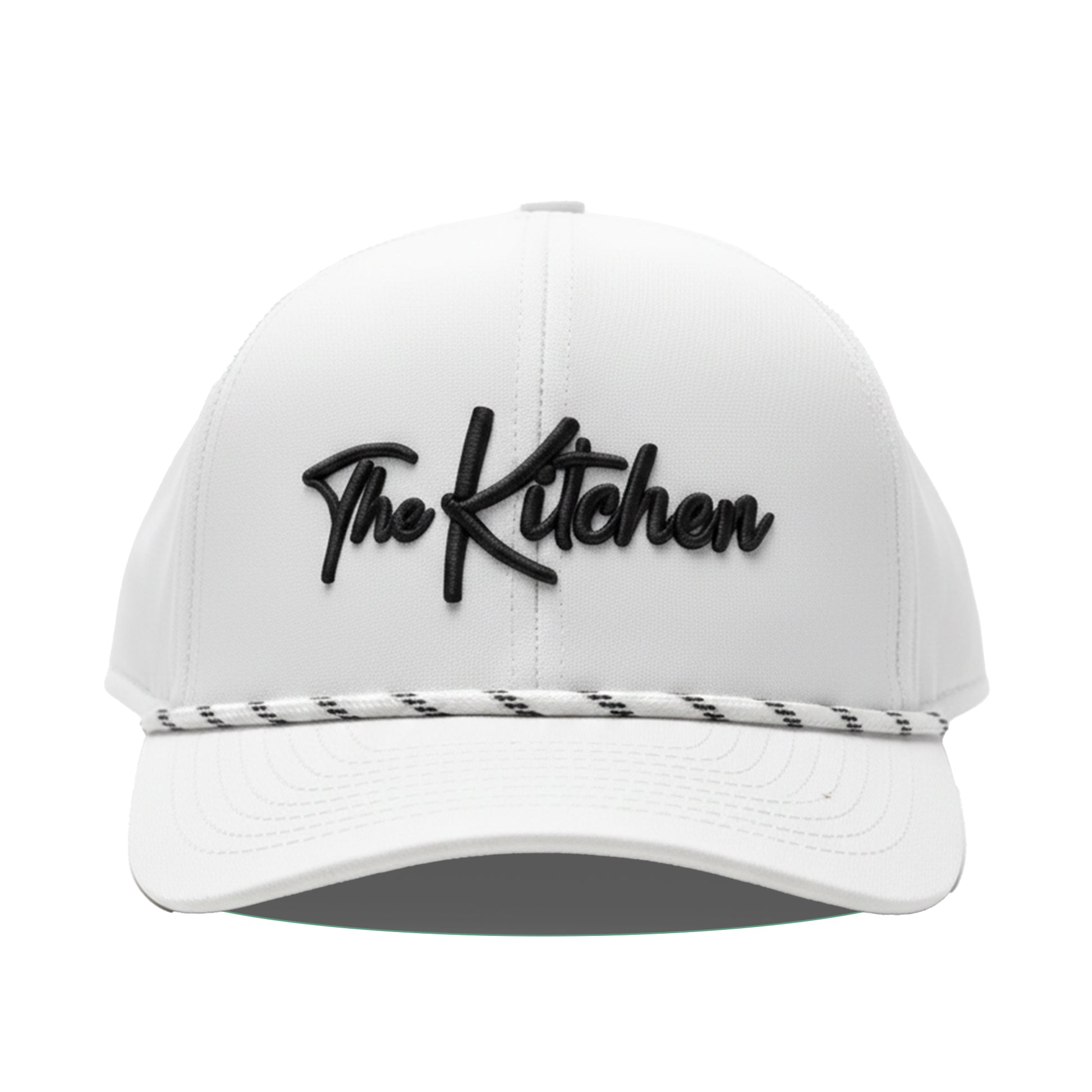 All white 6-panel performance rope hat with our classic black logo. Multi-color rope with black adjustable velcro strap. This one is clean and extremely comfortable. Perfect for the pickleball court or golf course.
